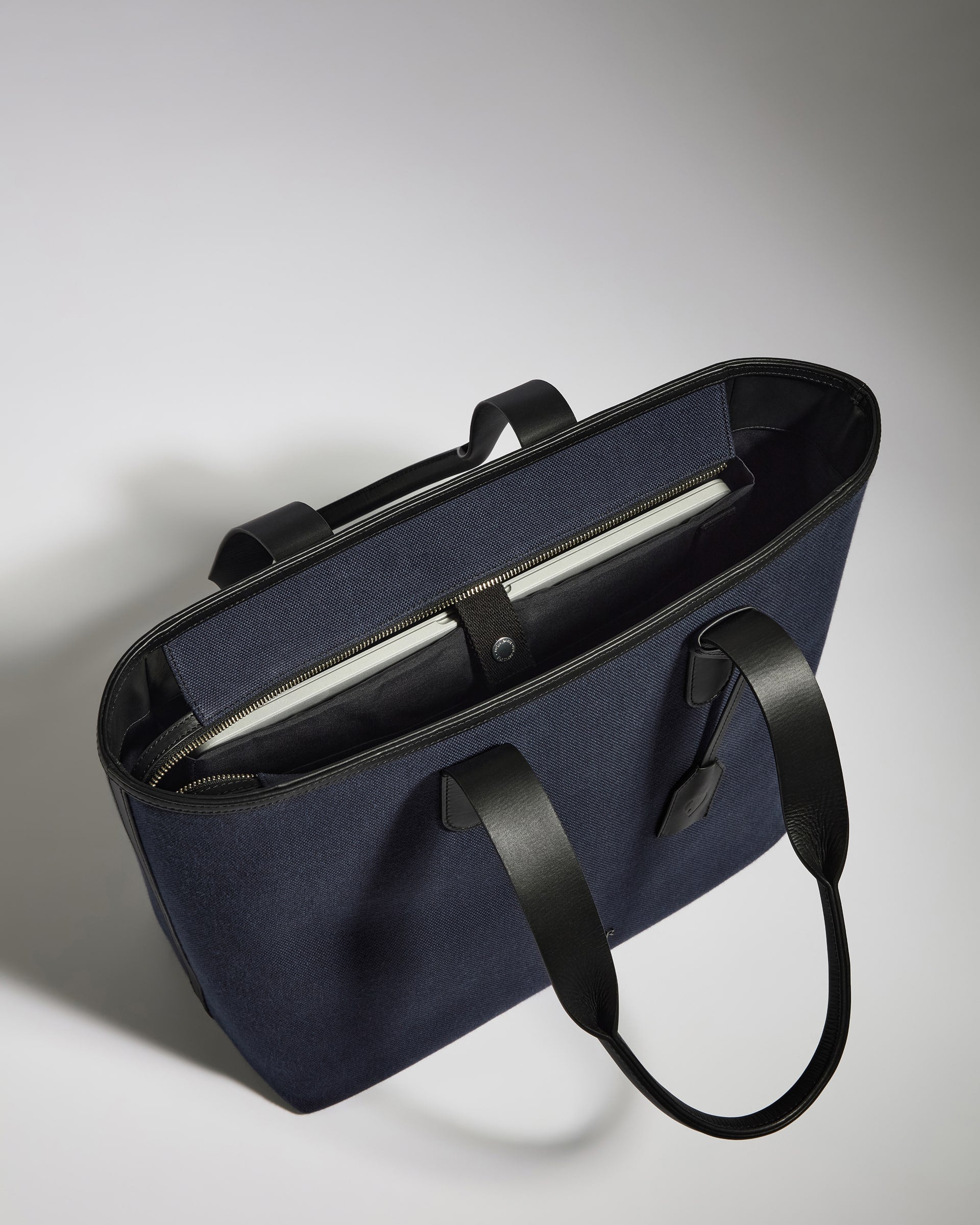 Water-repellent finishes and scratch-resistant leather trims ensure the bag stands up to daily use. Crafted with rolled leather handles and a comfortable shoulder strap that fits neatly over a coat, the Tote balances elevated detailing with smart practicality. Inside, a 100% recycled fabric lining houses a laptop sleeve, multiple slip pockets, and a key hook to attach small essentials and reduce rummaging.