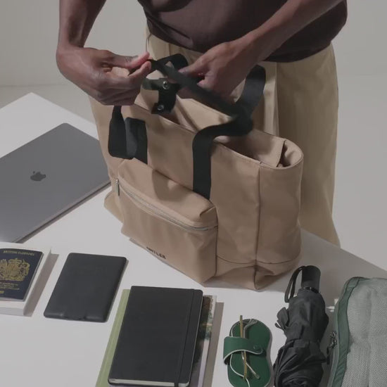 With a structured silhouette and understated detailing, this is the ultimate everyday tote. Made from 100% recycled, water-resistant fabric, the bag’s spacious design fits 14” and 16” laptops, with eight internal slip pockets to keep everything in its place. An internal water bottle holder keeps liquids upright, while the external front pocket offers easy access for compact umbrellas or other travel essentials.