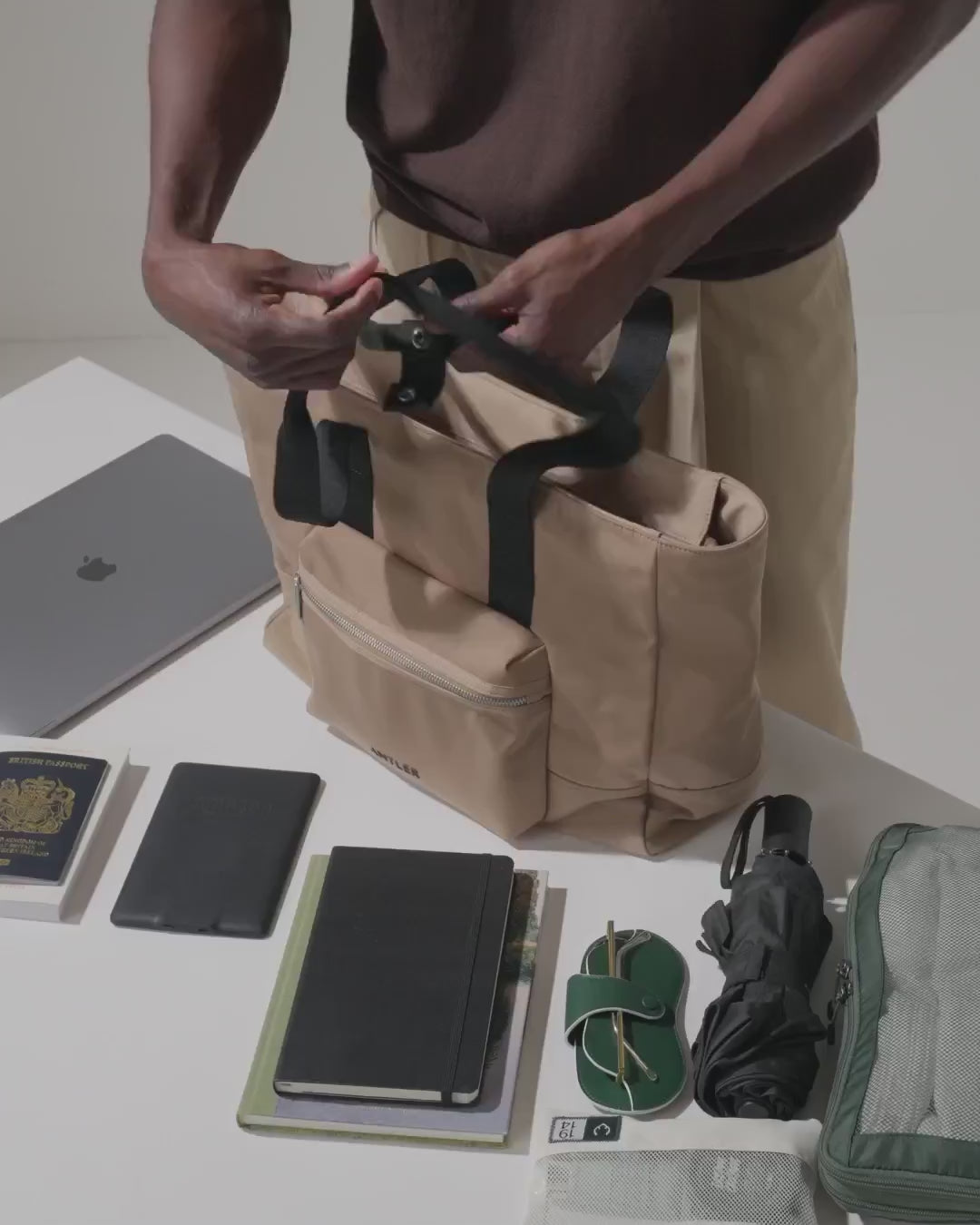 With a structured silhouette and understated detailing, this is the ultimate everyday tote. Made from 100% recycled, water-resistant fabric, the bag’s spacious design fits 14” and 16” laptops, with eight internal slip pockets to keep everything in its place. An internal water bottle holder keeps liquids upright, while the external front pocket offers easy access for compact umbrellas or other travel essentials.