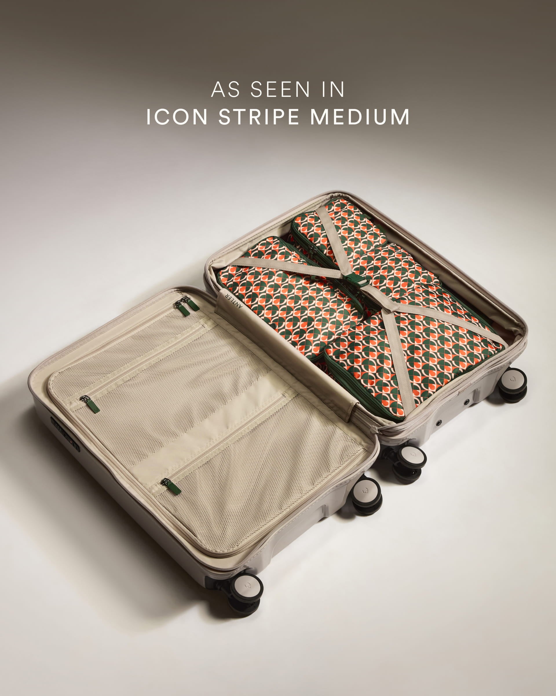 Antler's famous packing cubes reworked in the monogram print – a bold iteration of the ultimate travel hack. With an extra strong compression zip so you can pack more in, they’re the perfect size and colour to coordinate with our Icon Stripe suitcase.